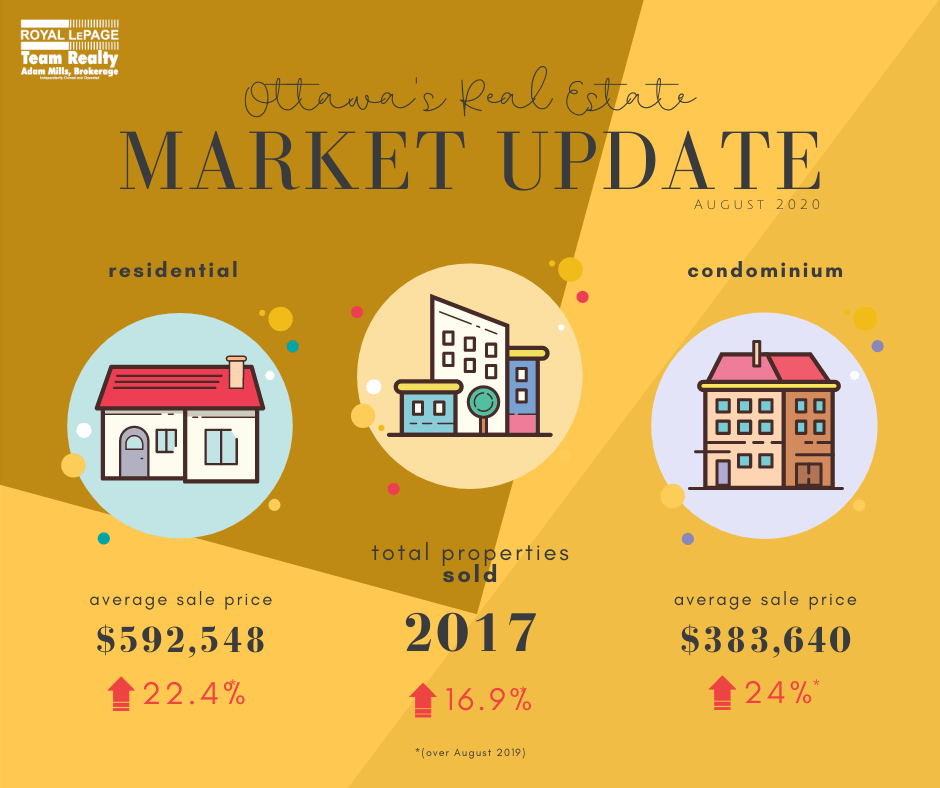 • The average residential sale price in August 2020 for a residential home in Ottawa was $592,548 an increase of 22.4% over August 2019;